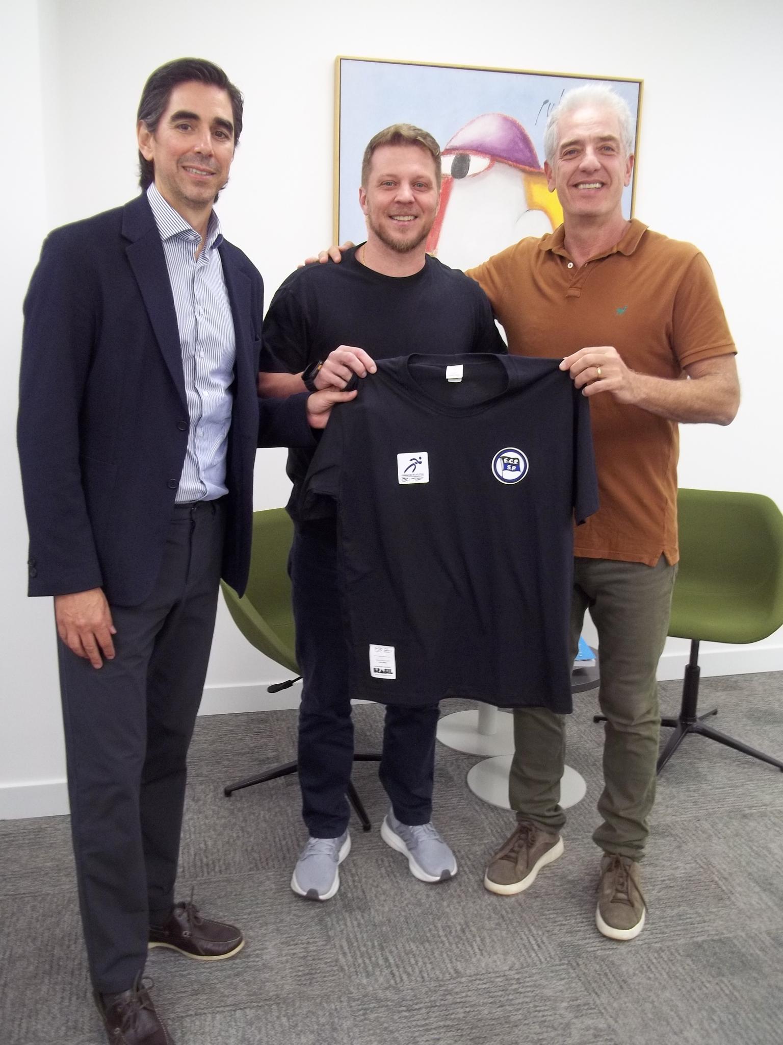 Gustavinho sendo recepcionado pelo diretor Rodrigo Montoro (à esquerda) e o Presidente do Pinheiros, André Fiore (à direita). Foto – Divulgação/ECP