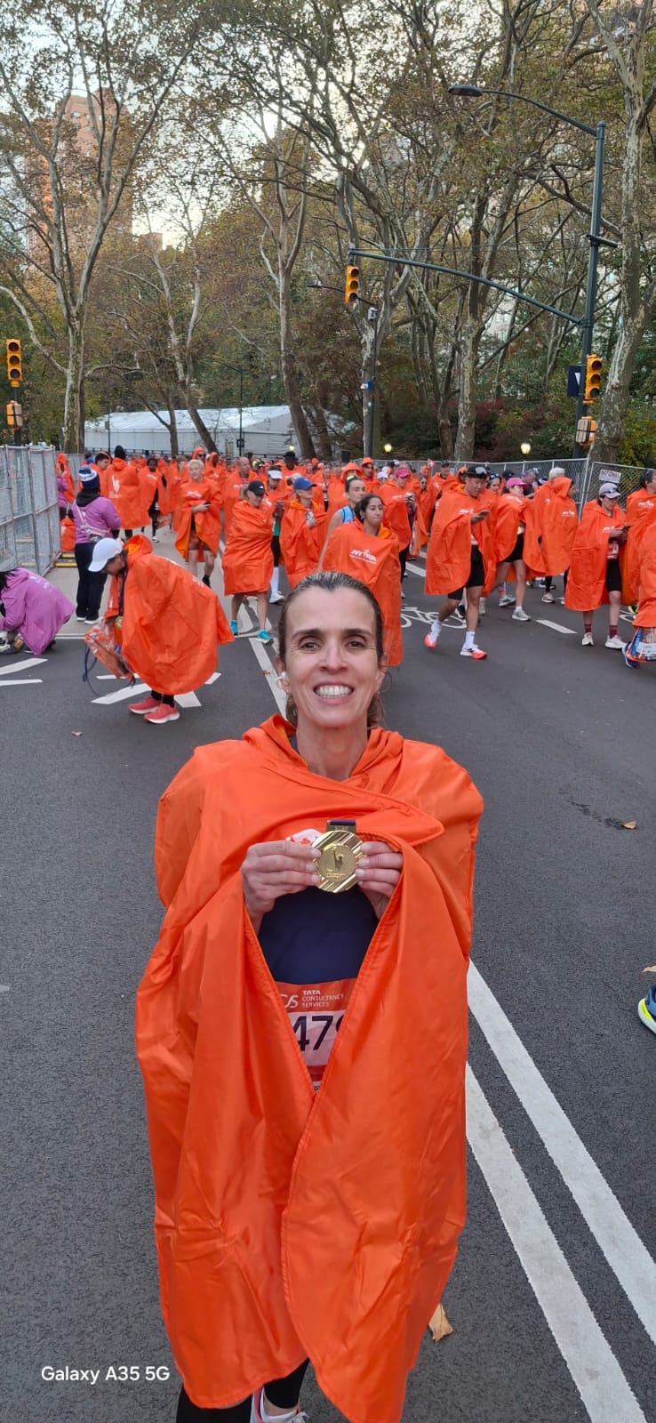 “Fiz meu último Ironman em Kona, em 2018, e minha última maratona em Chicago, em 2014. Esse ano de 2025 resolvi fazer a maratona de NY. Estava tensa por ter escolhido a maratona com o percurso mais difícil, mas no final deu certo! Dia estava lindo, meu filho estava me esperando perto da chegada. Muita emoção e superação. Completei com o tempo de 3h19min00”.