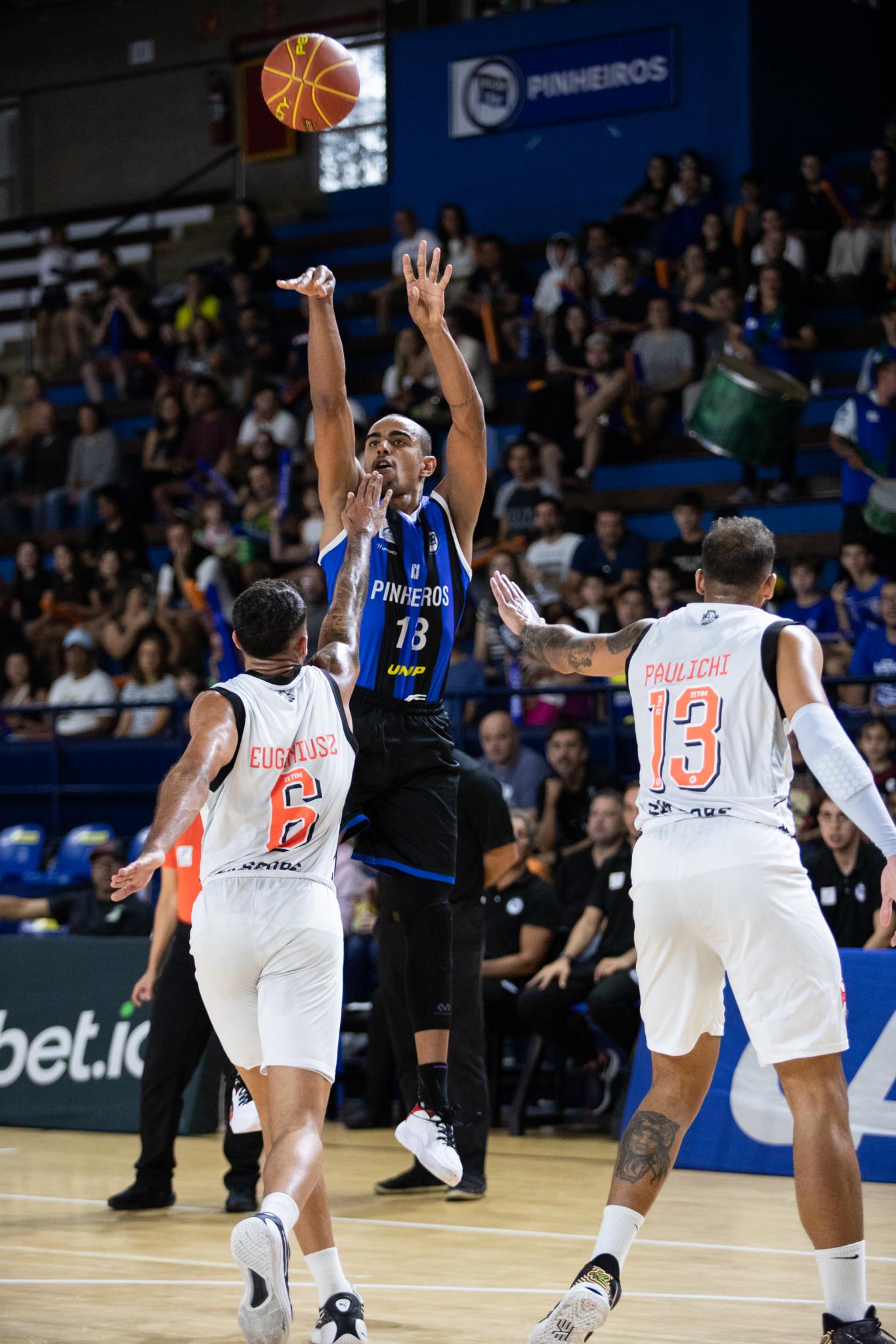 Segundo período – Com a mesma disposição defensiva do primeiro período, o Pinheiros alternou em vários momentos a liderança do placar. Porém, faltando três segundos, com um arremesso certeiro de três pontos novamente de Jimmy, terminou a primeira parte do jogo na frente: 36 a 34, com uma parcial 20 a 19.